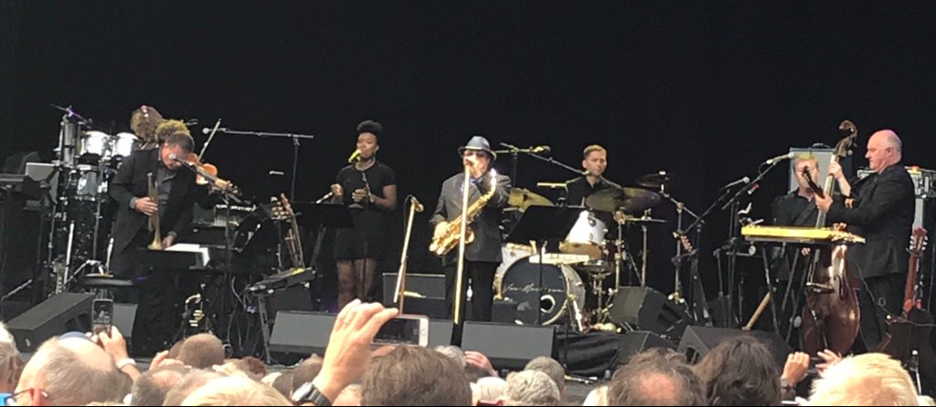 Morrison shows up on stage ten past eight on this very hot and sunny summer evening. He is wearing his customary dark suit, shades and a hat. He and his six-piece band deliverers a brisk 90 minutes set with mostly old numbers. The jazzy music is very tight featuring keyboards, guitars, bass, trumpets, fiddles, drums, glockenspiel and a woman singing funky backing vocals. Morrison stands front and center with a microphone in front of him and his unmistakable vocals is of course the most significant, but he also plays the saxophone and the harmonica.