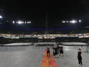 Once we had entered the arena we saw that the roof was closed and that would be the explanation to why we hadnโ€™t heard any soundcheck from the outside. It was a huge pit again and one weird thing that happened was that security didn’t allow us to go to the back of the pit in the first place. They tried to force us up front and when we refused they made us stand in the middle for five minutes before we were allowed back. To the question โ€œwhy?โ€ the guard (who probably didnโ€™t know any English) pointed to his headphones and said โ€œdirectivesโ€. When we got to the back of the pit we saw the open cables on the floor again, just like in Barcelona.