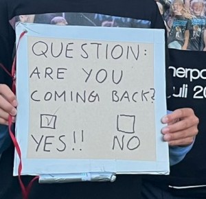 Bruce was in a good mood and interacted a lot with the audience. There was a sign that asked if he would come back, on which he ticked โyesโ with a sharpie. He also gave a lot of attention to two children who stood up front and gave some guitar picks to other young people.