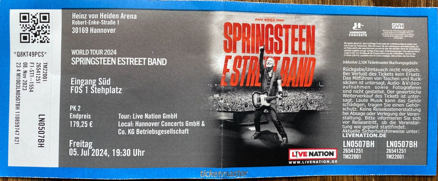 Due to the 2024 Football European Championship, only one (!) Springsteen show is scheduled in Germany this year. As a consequence it was also the hardest ticket the get your hands on. However, when it was settled that Germany would play the quarter-final against Spain, in said championship, on the exact same day as the Springsteen show more tickets suddenly started to show up.