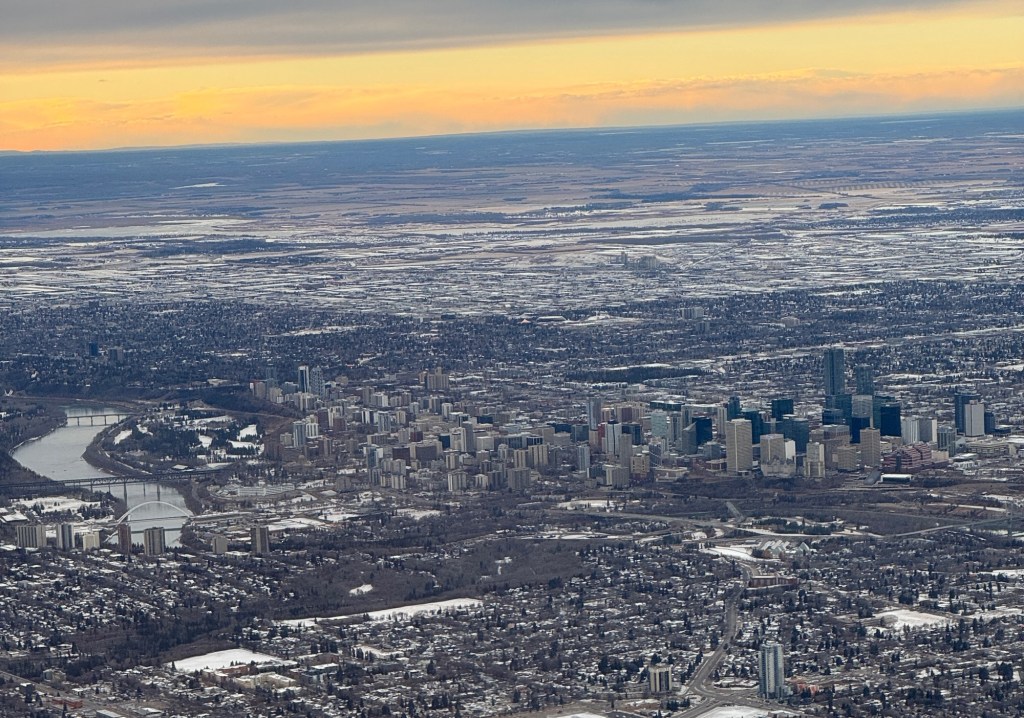 It was finally time for our long awaited trip to Canada! Routinely when we travel our points of depature differ, but luckily we always and eventually arrive to the same destination. This time I had a morning flight to Amsterdam, where I changed to an Edmonton bound carrier. Oliver first flew to Munich, where he had a long layover, then he had a flight to Vancouver before entering the delayed flight to Edmonton. Consequently, I arrived first and it was still light out as my plane approached Edmonton International Airport (YEG). I was lucky to catch a glimpse of the landscape through the aircraft window. It had a pale brown/beige tone, some powder snow and it looked cold. When the plane made a turn I could see the city of Edmonton in the distance.