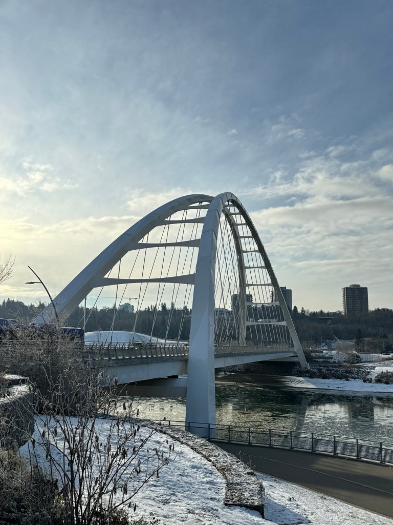 It was still before lunch when we made our way to the Walterdale Bridge, which is a beautiful bridge over the North Saskatchewan River with two prominent white steel arches rising over the deck. Crossing it gave us a striking view of the city skyline. It was a really cold day, but the sun broke through the clouds and made it a bit warmer. On the south bank we walked through Queen Elisabeth Park and back to the north side over another bridge, the Dudley B. Menzies Bridge. In the evening we met up for dinner and beer with our friend Andreas who had arrived with bus from Calgary.