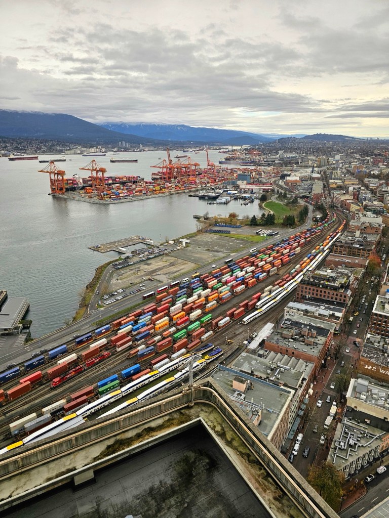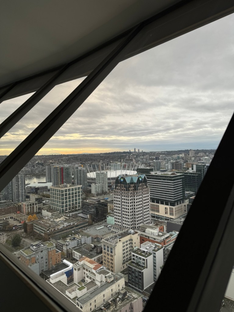 For urban explorers like Oliver and I, looking for cosmopolitan vibes, Vancouver had much to offer. One of the first attractions we visited was the โVancouver Lookoutโ, which is a 168.8 meters tall tower and an iconic landmark in Vancouverโs skyline. To access the deck you had to ride a glass elevator, which ascended to the top on the outside of the building ๐ฑ. We spent more than an hour studying the panoramic perspective of Vancouver.
