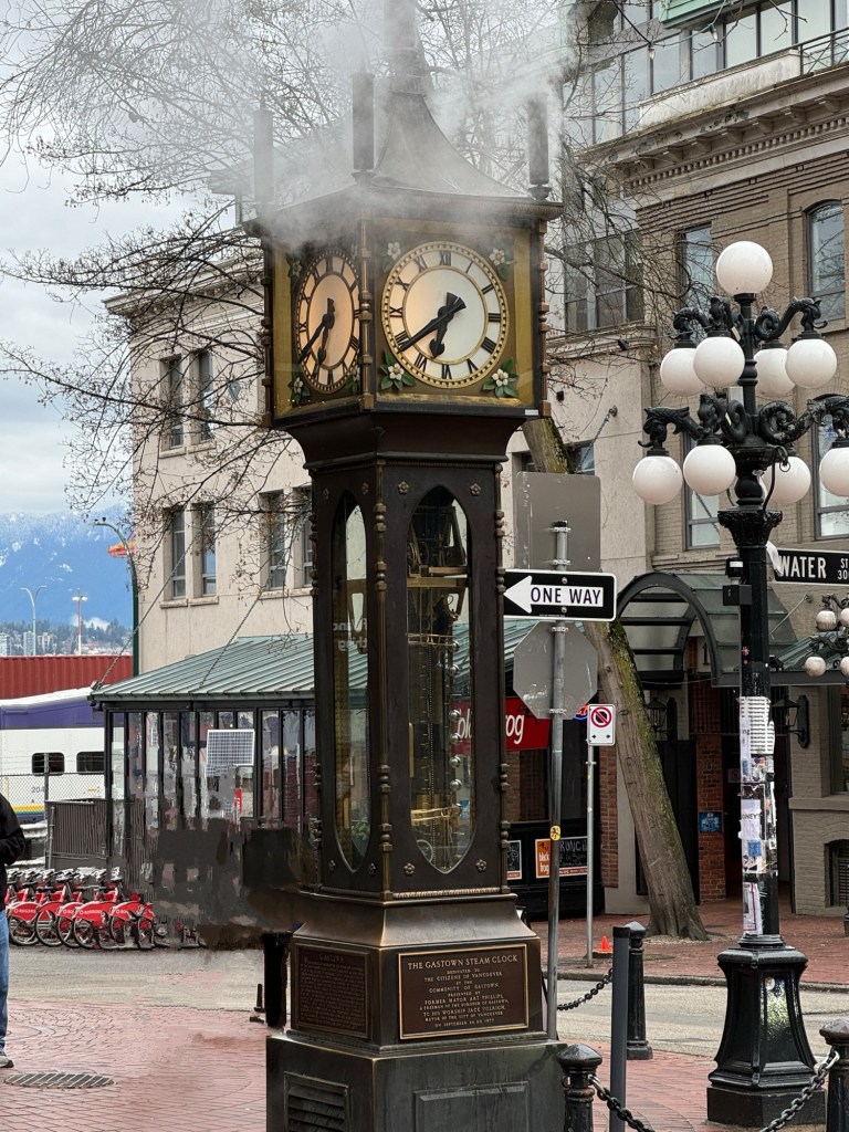 Gastown is a historic neighbourhood with charming cobblestone streets just a few minutes from the tower. In Gastown there were lots of tourists, souvenir shops and โtrendyโ (expensive) restaurants. A key highlight of Gastown was the Steam Clock. Tourists gathered there to see the steam driven clock whistle and chime every quarter-hour.