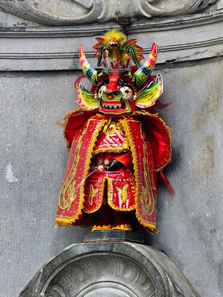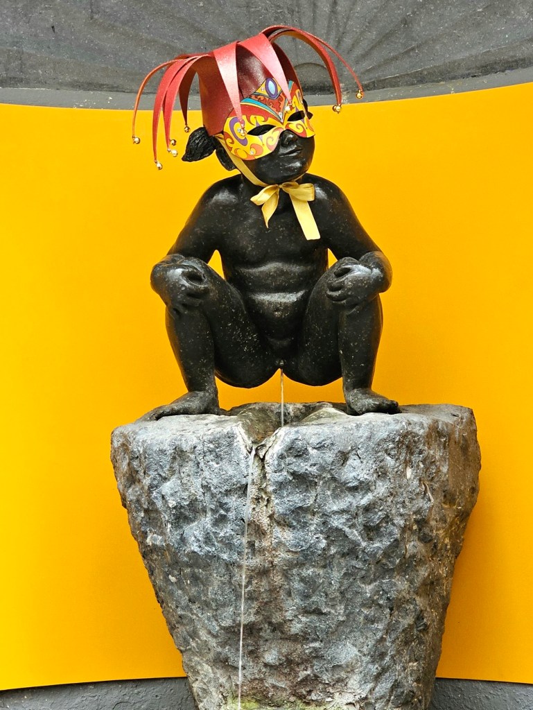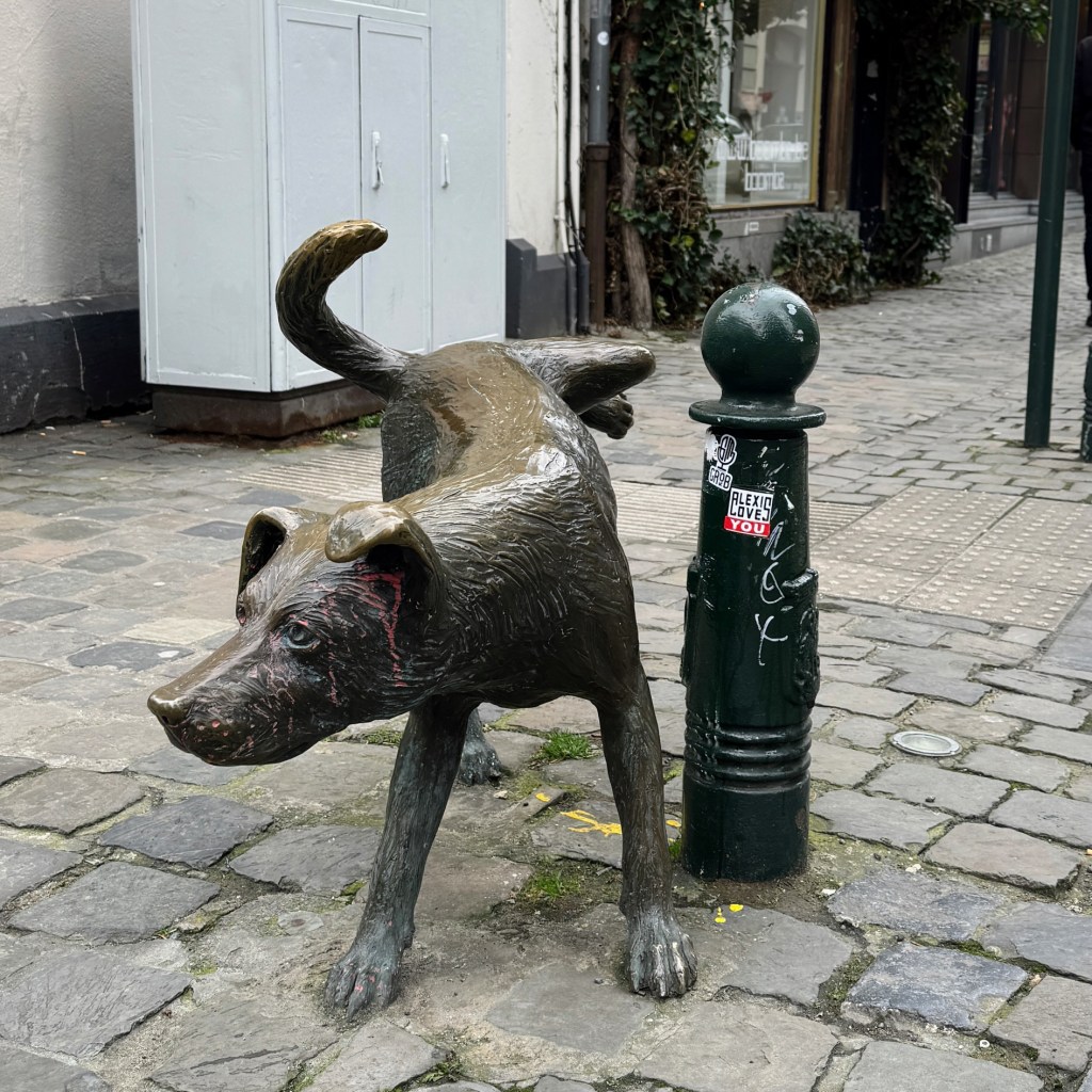 During our stroll through Brussels before the show, I suggested that we should do a ”Peeing Statue Tour” and Oliver reluctantly agreed. We started by revisiting Manneken Pis, even though we had already seen him the last time we were in Brussels. Maneken Pis is a tiny bronze statue of a little boy urinating into a fountain. He has been a symbol of Brussels since the 17th century and is known for being dressed in different costumes throughout the year. This time, he was dressed in a colorful carnival outfit. Just a short walk away, we found Jeanneke Pis, his female counterpart, also dressed up for the festivities. The narrow alley where she’s located made her feel like a hidden gem. Our final stop was Zinneke Pis, the peeing dog statue. While it was fun to see, it didn’t quite match the playful, historic style of the other two, making it a bit less exciting. Still, it was a quirky addition to our tour, which then ended. The weather wasn’t really cooperating and even though we had had a short stop for warm coffee and a pastry, at the fabulous Aux Merveilleux de Fred, we felt a bit cold and decided to go back to the hotel.
