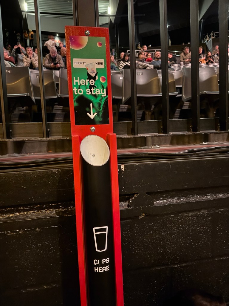 As we entered the GA section, we found a spot on the right-hand side, where we could stand with our backs against the wall. It is always nice to have something to lean on and rest against during a show. Right next to us, and at several spots around the arena, was a small ”collection station” where people could place their empty beer cups for reuse as part of the venue’s commitment to reduce waste.