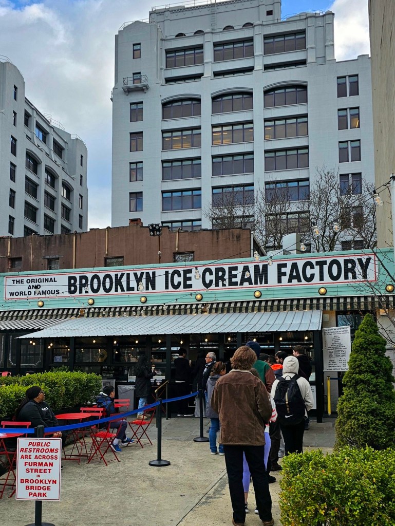 On the other side of the Brooklyn Bridge, though, there was a proper reward waiting: ice cream from the Brooklyn Ice Cream Factory. We shared a dish with three scoops; vanilla, coffee, and chocolate chocolate chunk. Sitting there, resting our feet, enjoying the views and the sunshine, was a perfect break before heading to our evening plans.