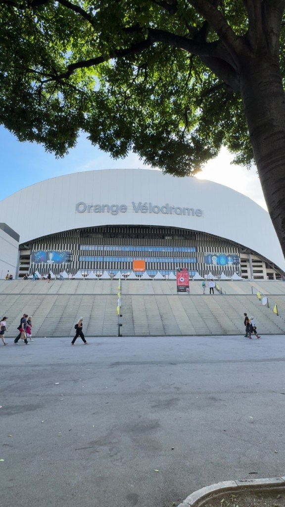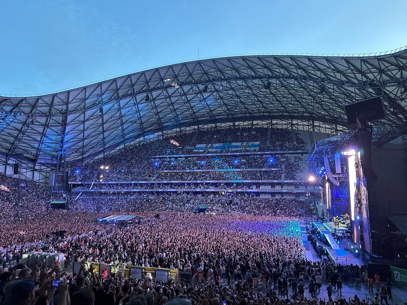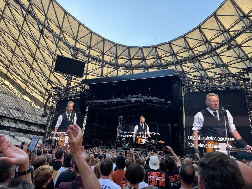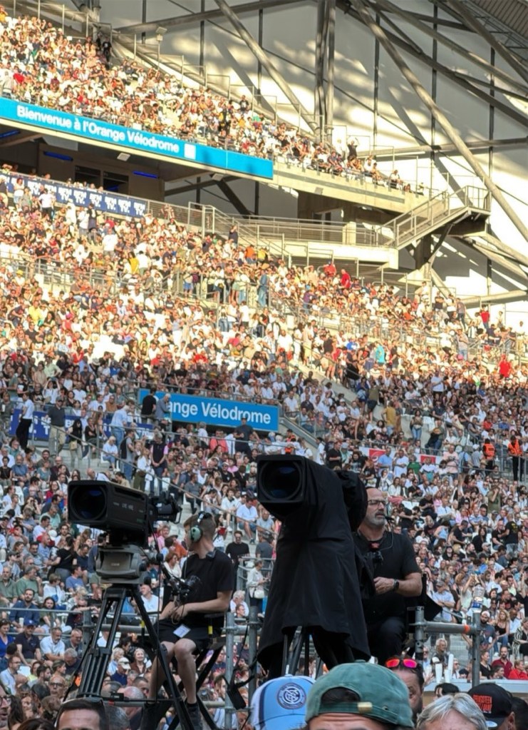 The Orange Vรฉlodrome is an impressive venue. Itโs modern and massive. With a capacity of over 67,000, itโs the second largest football stadium in France. Last nightโs concert reportedly drew over 61,000 people, and it felt like it. The pit was packed, and I heard from some folks up front that it got uncomfortably crowded and warm. But toward the back, where I was, it was full but breathable and enough space to jump around and dance without bumping into anyone.
