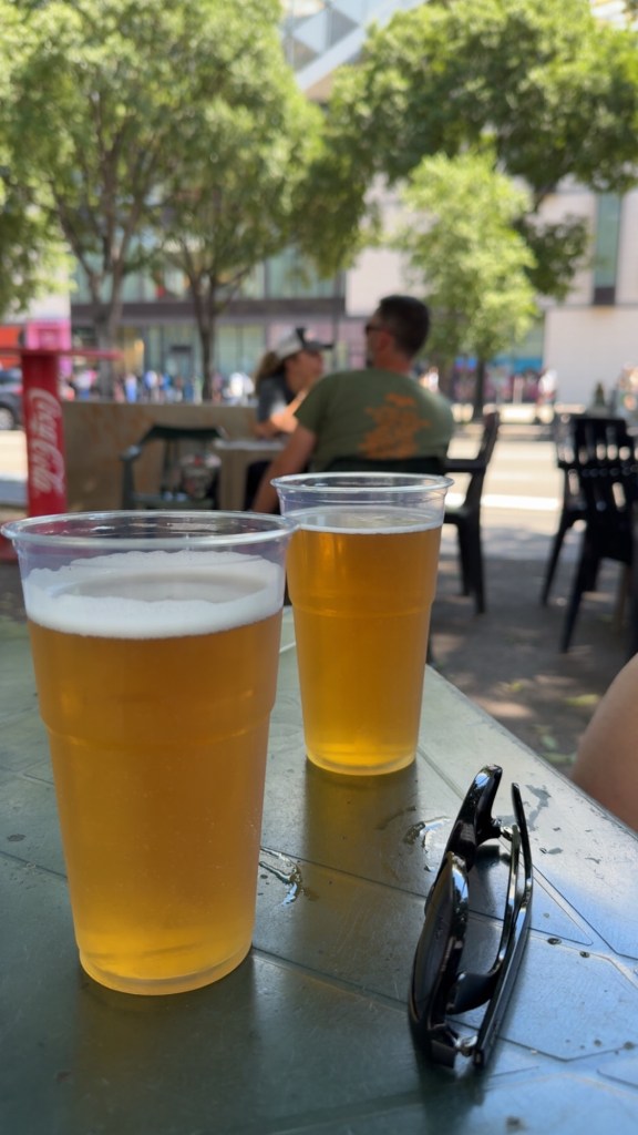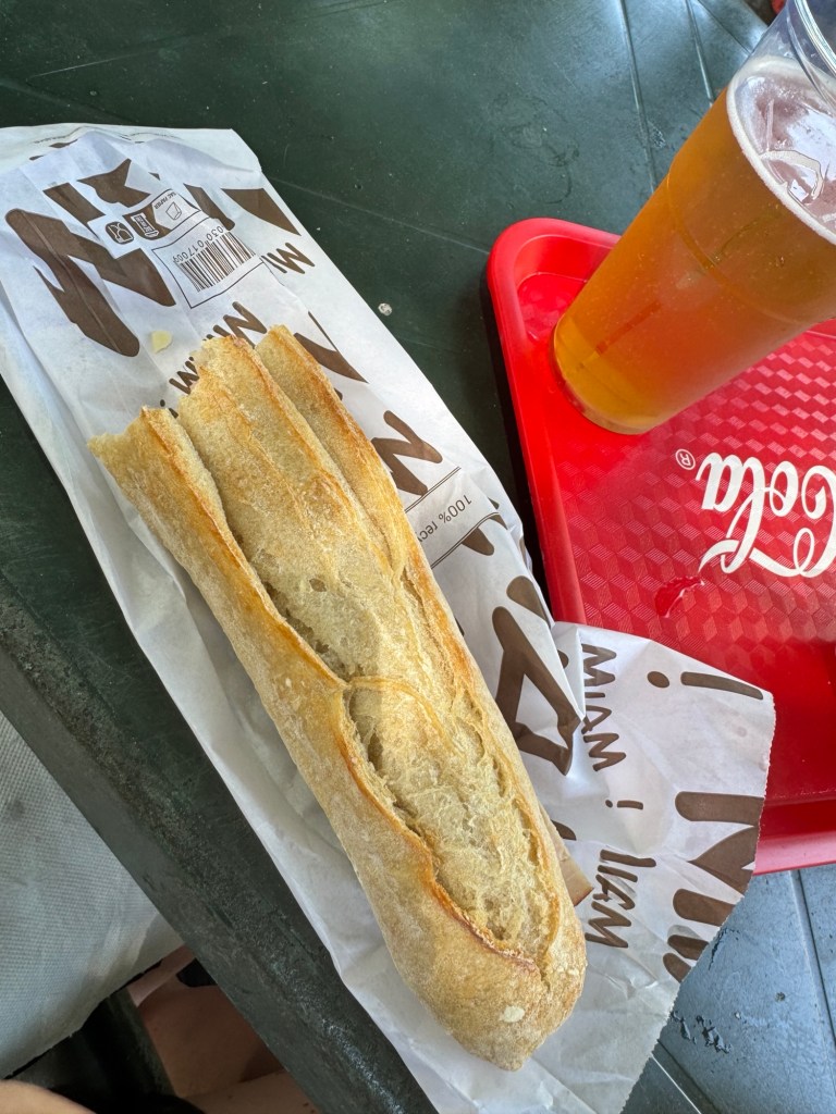 Around lunchtime we made our way toward the Orange Vรฉlodrome and returned to a little bar opposite the iconic steps leading up to the arena. That place now comes with a bit of history for us. Last year, just before the cancelled show, we sat there and talked with a father, his brother, and the son, three Springsteen fans who had driven all the way from northern France. It was the sonโs first concert ever, or was supposed to be, until everything got called off just twenty minutes before the gates were meant to open. This time, things looked more promising. Werner came to join us there after flying in from Cologne, and we settled in with a couple of beers, enjoying the pre-show atmosphere. When we got hungry, we went full-on French: BAGUETTE with FRENCH fries and another round of beer, in classic plastic mugs. ๐ซ๐ท๐ฅ๐