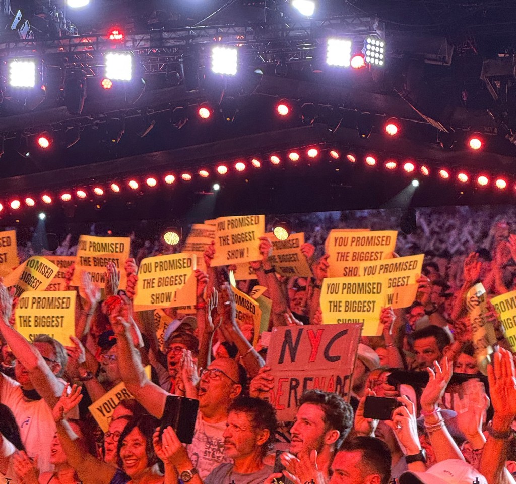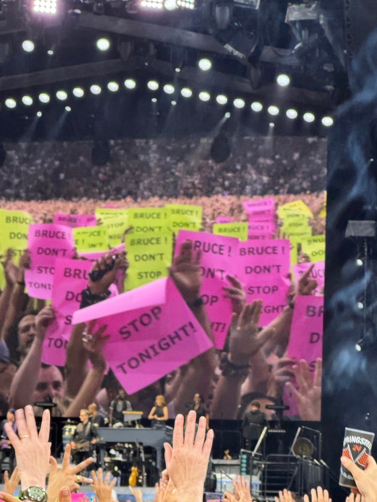 Just before the encores, as Bruce and the band were saying their goodbyes, a wave of yellow signs popped up in the front rows reading: โYou promised the biggest show.โ Toward the very end, more signs appeared, this time in pink and yellow, urging: โBruce donโt stop tonight!โ I wasnโt entirely sure what they meant (play all night? go past midnight?), but whatever the message, they seemed to do the trick.