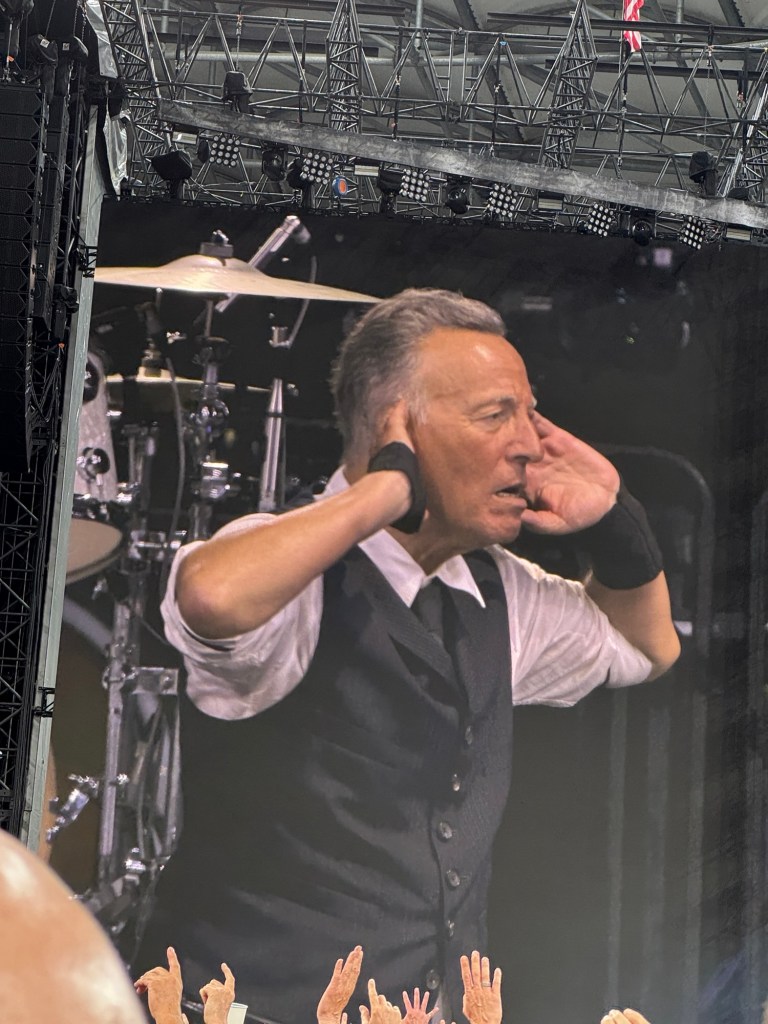 First a quick recap: The Manchester show had set the tone. We had seats, but that didnโt take away from the energy. What stood out was the shift in message, how clearly political the first half of the show was. Bruce didnโt hold back in his criticism of the state of things back home, calling out the Trump administration as corrupt and treasonous. The speeches were followed by songs that deepened the message: Land of Hope and Dreams, Death to My Hometown, Long Walk Home, My City of Ruins, Rainmaker, Murder Incorporated. And Chimes of Freedom to close. It felt like more than just a concert.