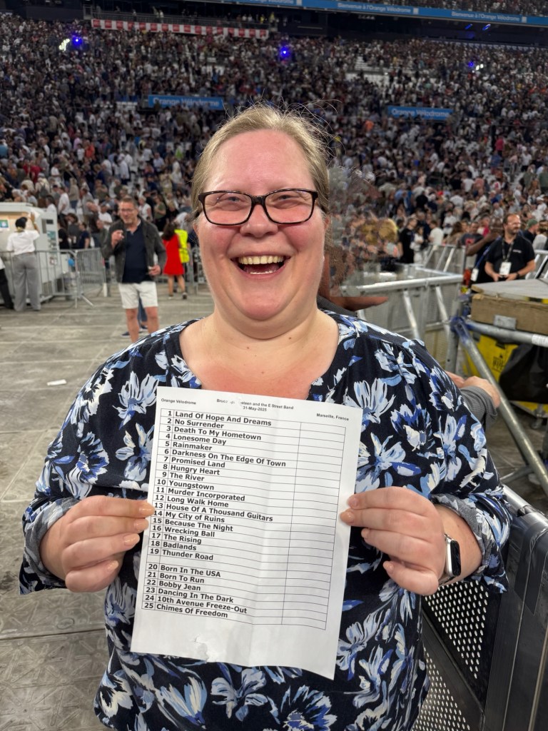 To our delight, Bruce added Twist and Shout, a fun and unexpected surprise for the night, even though, according to BruceBase, itโs far from rare. In fact, Bruce has been playing that song since 1965, and last night marked the 471st time. Still, it hit the spot, turning the Vรฉlodrome into one big party. After that, he closed the show with Chimes of Freedom.