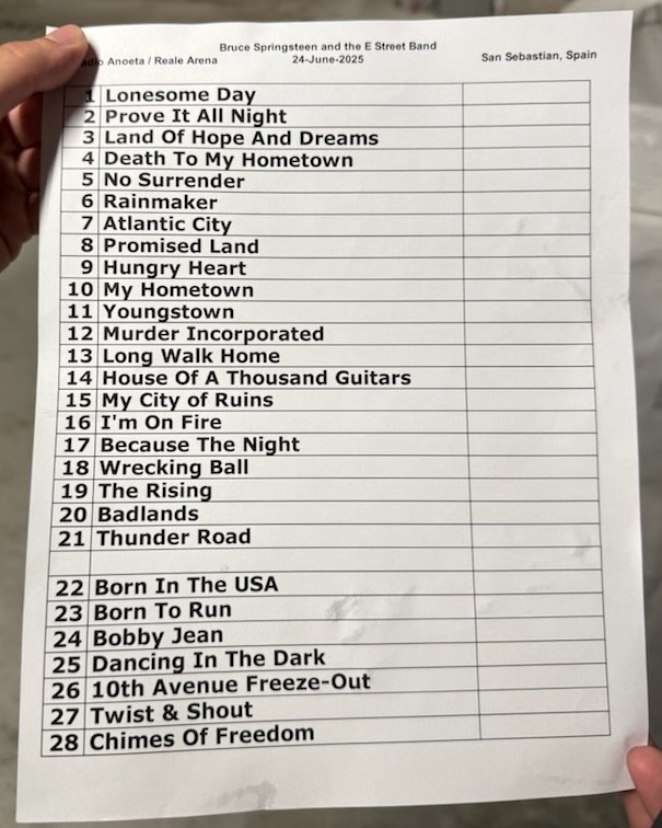 Compared to the printed setlist, a few changes were made after the break. My City of Ruins was dropped and replaced with Growin’ Up (my first time live), My Love Will Not Let You Down, Darlington County and Working on the Highway. Things got back on track with I’m on Fire (which was also soundchecked) and the only other addition later in the set was Glory Days in the encore.