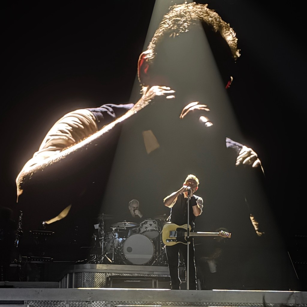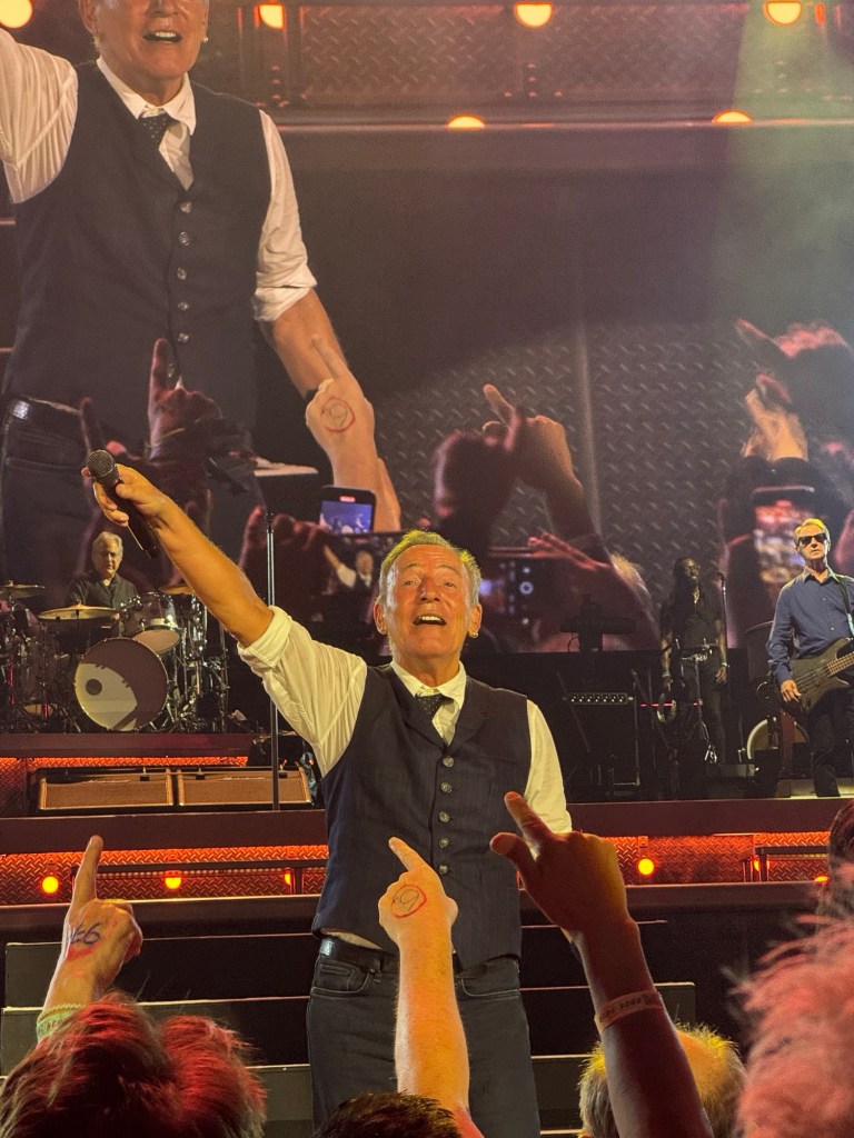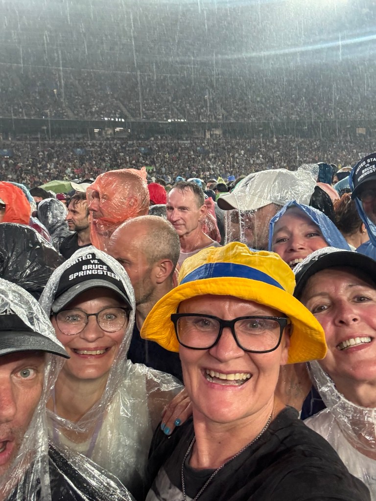 I had left my rain poncho in the apartment (rookie mistake) with the lovely weather earlier in the day, I never thought I’d need it. I was soaked to the underwear, no exaggeration. A kind woman behind me offered to take care of my phone when it really started coming down, which was such a relief. Security had us step back from the rail for safety. At one point Bruce came up at the back of the stage, waved and cheered us on.