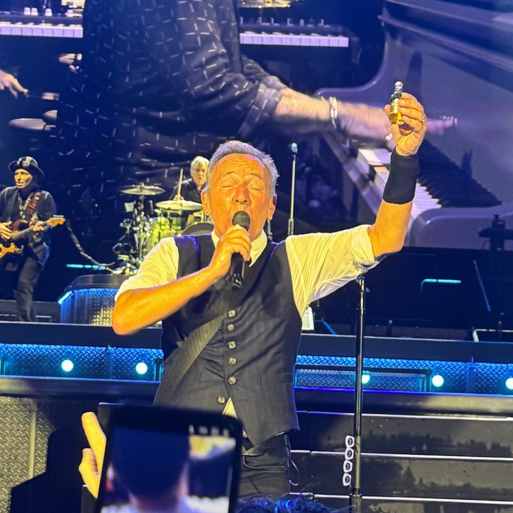 After the break, Bruce seemed determined to get us warmed up and to match us. He mixed up the setlist and went to his sponge several times to wet himself down and kept coming down to the podium to be close to the crowd. At one point, he spotted a souvenir bottle (whiskey, maybe?) asked for it to be handed over, drank quite a lot, and tossed the rest over the audience.
