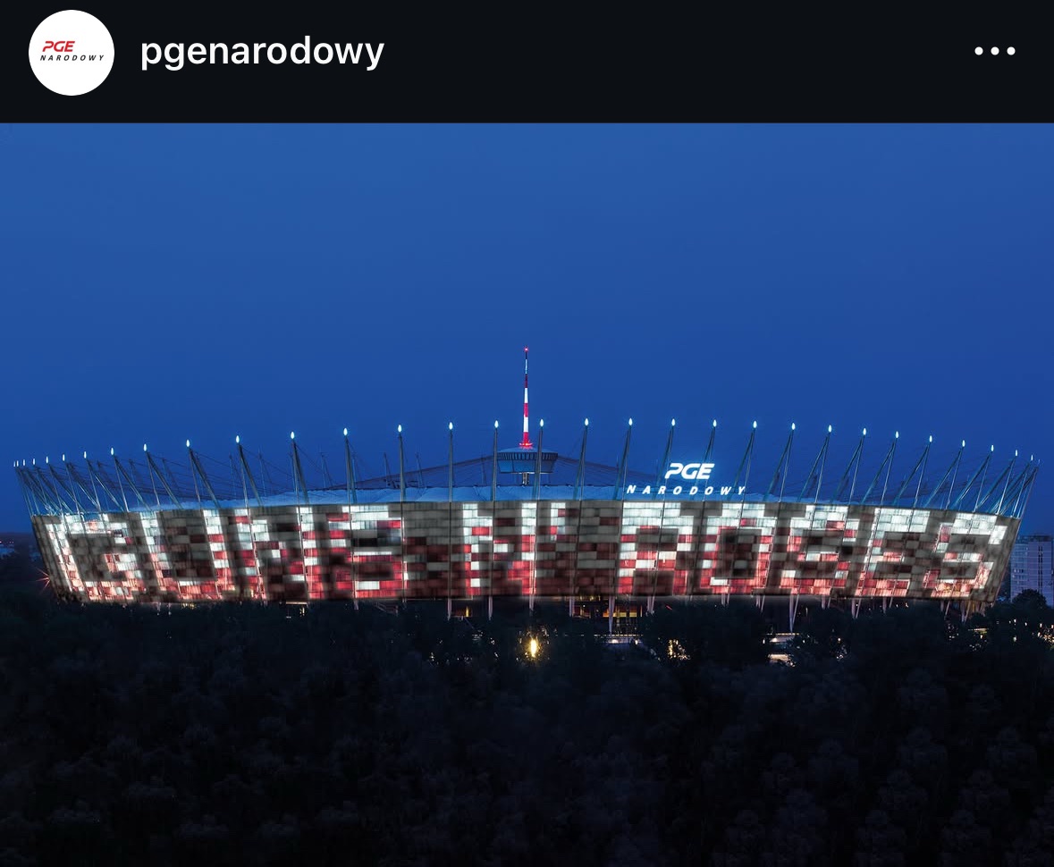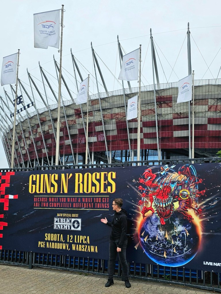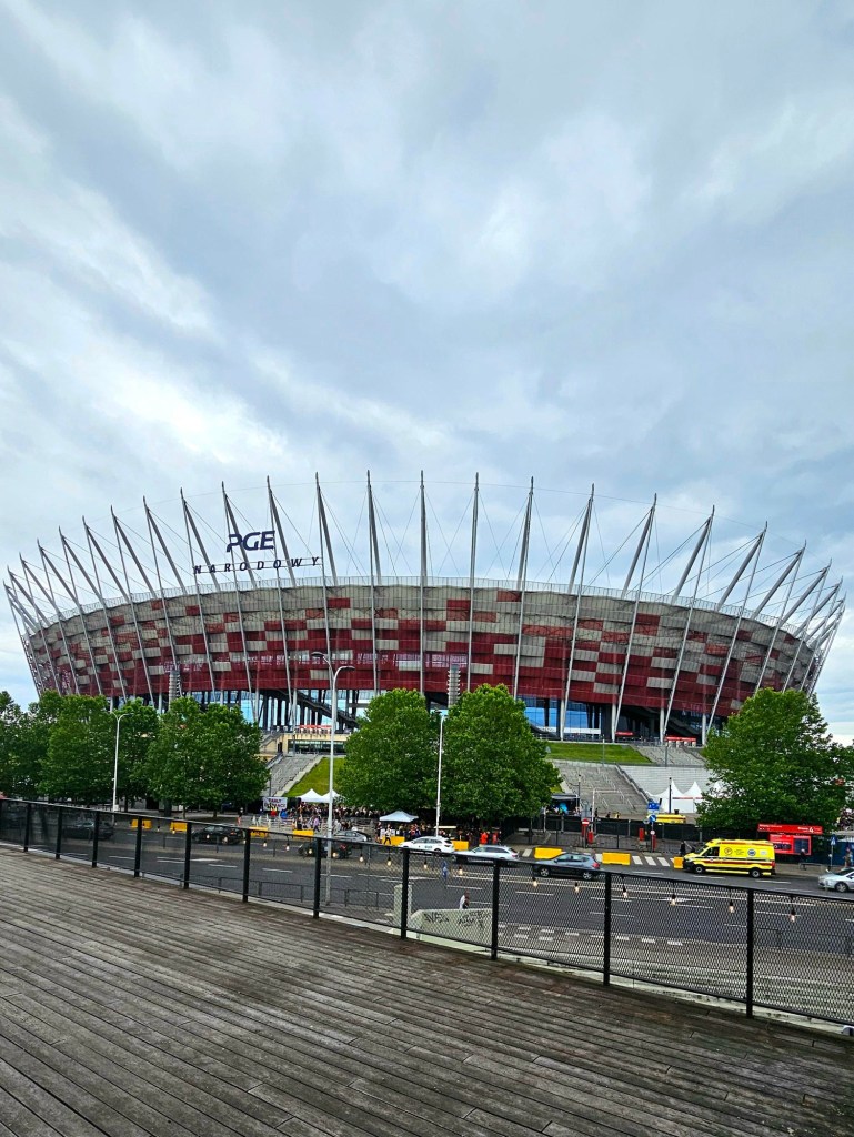 PGE Narodowy is Warsaw’s modern national stadium, built in 2012 with a retractable PVC roof, which, thankfully, was closed during the concert, as rain was on the way. Visually, it’s an impressive venue: polished and wrapped in red and silver mesh that mirrors the Polish flag. That night, the band’s name was even projected onto the exterior, though we didn’t see it ourselves. We had “early entry” tickets and were already inside by 4 p.m.