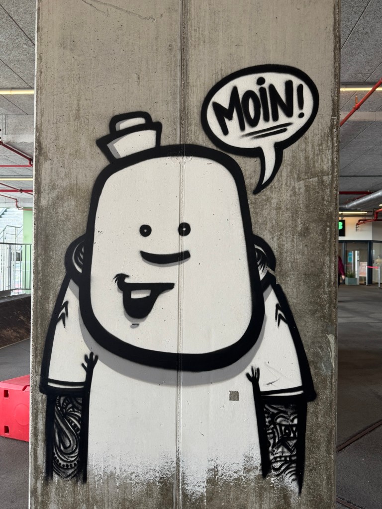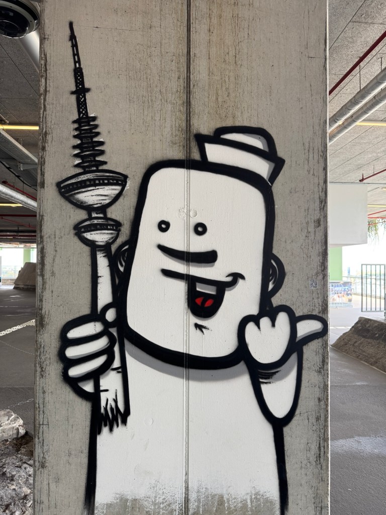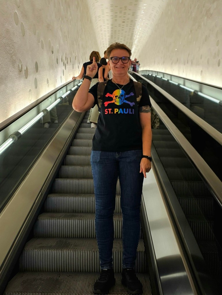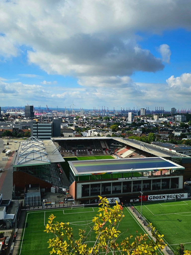 On the way we stopped at the FC St. Pauli fan shop, and both of us bought T-shirts. I went for a black one with the classic skull logo in rainbow colours. Oliver, meanwhile, already has a special connection to St. Pauli. Heโs a member of the clubโs Genossenschaft (Cooperative). The funny thing is, he only became one after being lured into it when he signed up with Congstar, a telecom company that happens to sponsor the team. Oliver isnโt really interested in football, but now he claims he is. He joked that part of the stadium we had walked passed earlier was technically his.