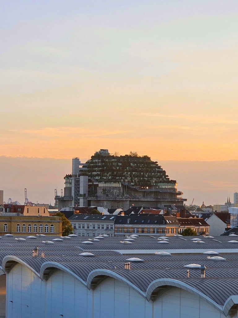 After breakfast on Saturday, the concert day, we headed out for some sight-seeing. We hadnโt been able to get hold of tickets for Miniatur Wunderland so we walked towards the famous and special landmark Der Bunker St. Pauli. The massive bunker was built by the Nazis during the Second World War as an air raid shelter and anti-aircraft tower with room for tens of thousands of people. Now it has a unique rooftop garden, a hotel, restaurants, and spaces for cultural events, sports, and an art-in-residence program. From the outside itโs still looks a giant concrete block, but the upper half is now covered with trees and flowers, almost like a green hill has grown out of the building.