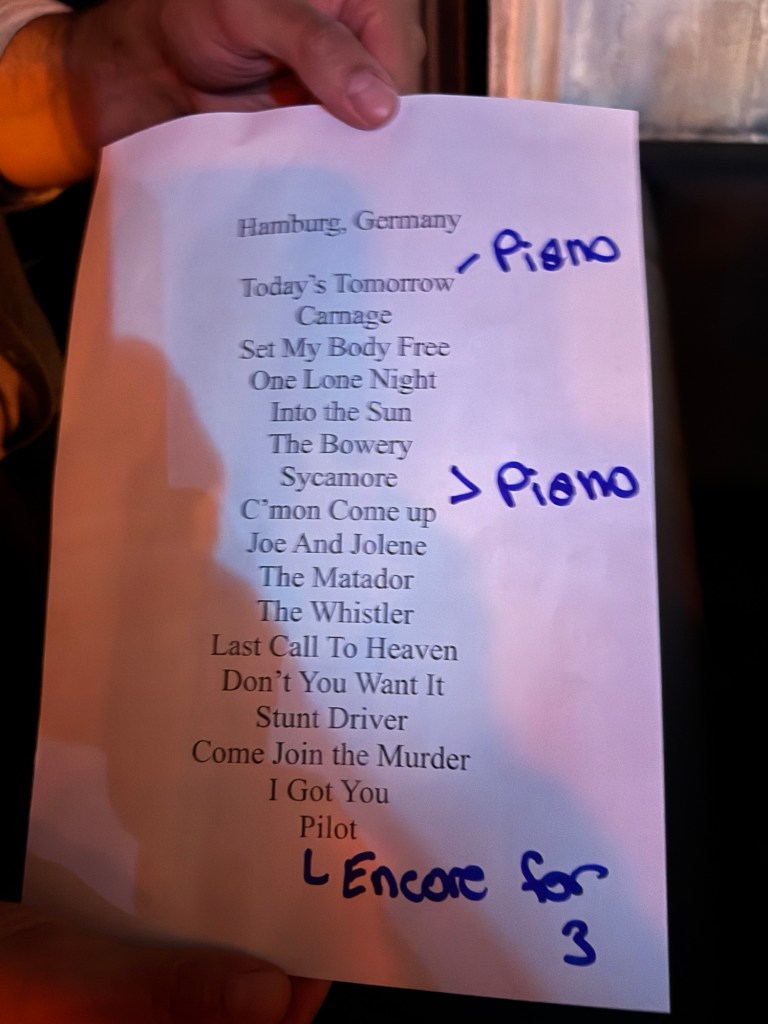The concert was authentic, vibrant, raw, and playful. We both liked it a lot. We were standing at the back by the sound board, which gave us a good view, and I managed to snap a photo of the setlist before a fan grabbed it. When it was all over, it actually felt nice to step outside and breathe some cooler air again.
