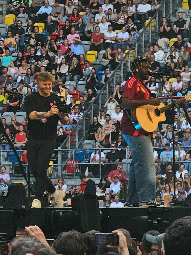 Before Sheeran came on, the audience was warmed up by two support acts. Tori Kelly opened the evening, though her set felt a little flat, with many still finding their seats. She later returned to the stage for a duet with Sheeran on I Was Made for Loving You. The second act, Myles Smith, closed his energetic set with his best-known song Stargazing, which got the crowd going.
