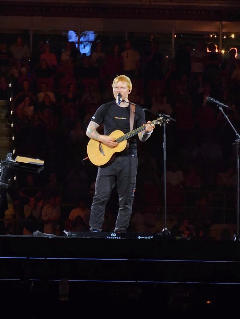 At 20:05 the giant screen above the stage began to lower and a timer counted down from ten minutes. When only ten seconds remained, the entire stadium joined in the countdown. Ed Sheeran appeared in a simple outfit of black trousers and a black T-shirt, with “Düsseldorf” printed in the colorful style of his Mathematics Tour branding.