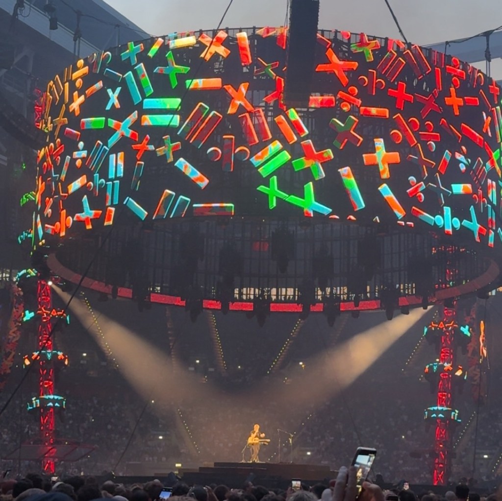 The stage was placed right in the middle of the stadium. It was a large circular platform with a moving belt around it that Sheeran and his guests could walk on. Hanging above was a huge cylindrical screen, showing animations, album artwork, and visuals that shifted with each song.