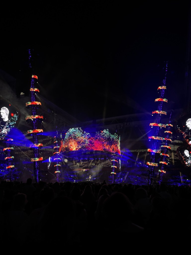 He started off with a guitar solo, layering beats with his loop pedal. That’s really his trademark. He’s using the loop-pedals to build the songs live, piece by piece, while still being able to move around and interact with the crowd. Once he got going, he launched into Castle on the Hill and the whole stadium sang along. Later each track had its own visuals: butterflies flying across the screen, bright backdrops or graphics tied to his album artwork.