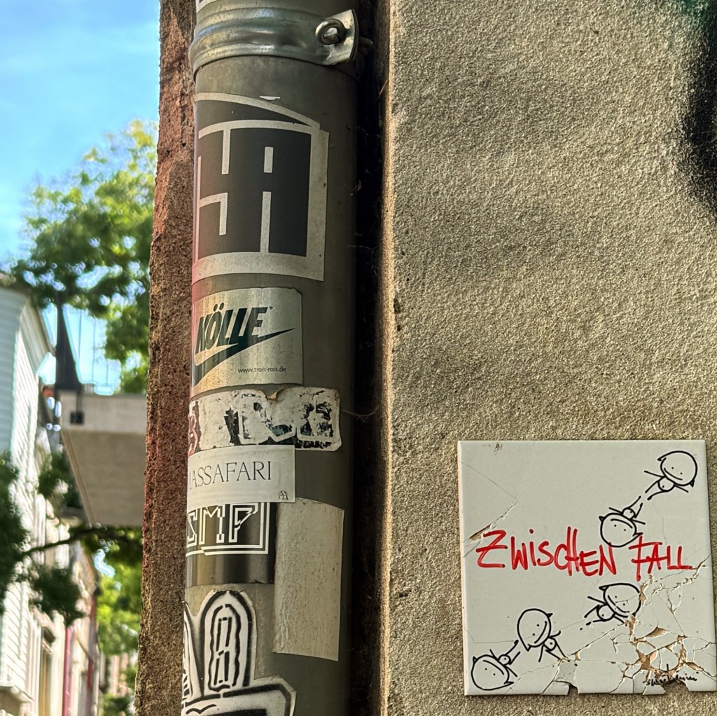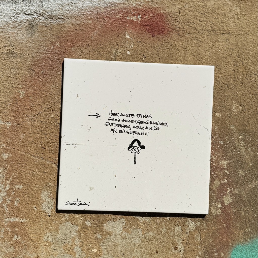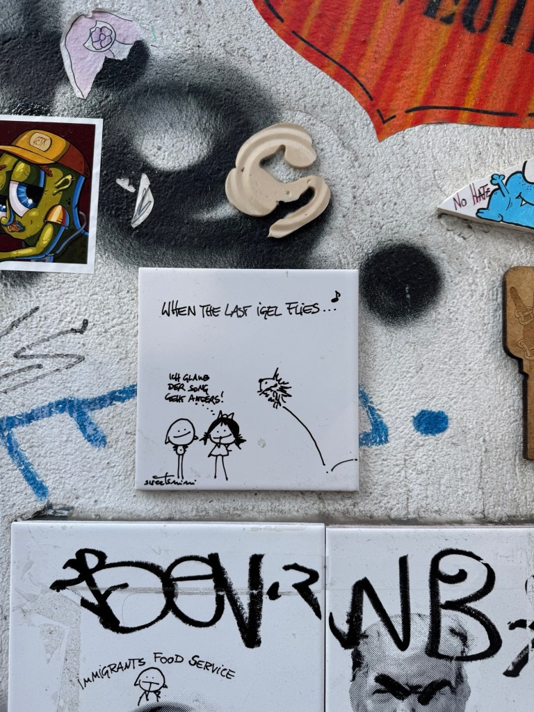 Since we skipped sight-seeing in Düsseldorf before the show, Sunday became our chance to slow down and enjoy Cologne before I had to head to the airport. We had breakfast outside in the sunshine and then wandered through Köln-Ehrenfeld. I always end up scanning the walls for Sweetsnini tiles, and this time I spotted five of them! Sweetsnini is a Cologne-based tile artist whose little “Ninis” characters have been appearing around the city since 2016, often with witty or pointed remarks about current events. Her hand-drawn tiles have spread to Hamburg and Berlin as well, but Ehrenfeld is her home turf. When walking there I make a habit of treasure hunting for the tiles and I recommend everyone who visits to do the same. Her artwork can also be found in the Urbanshit-gallery