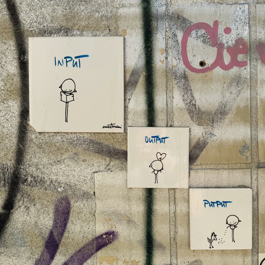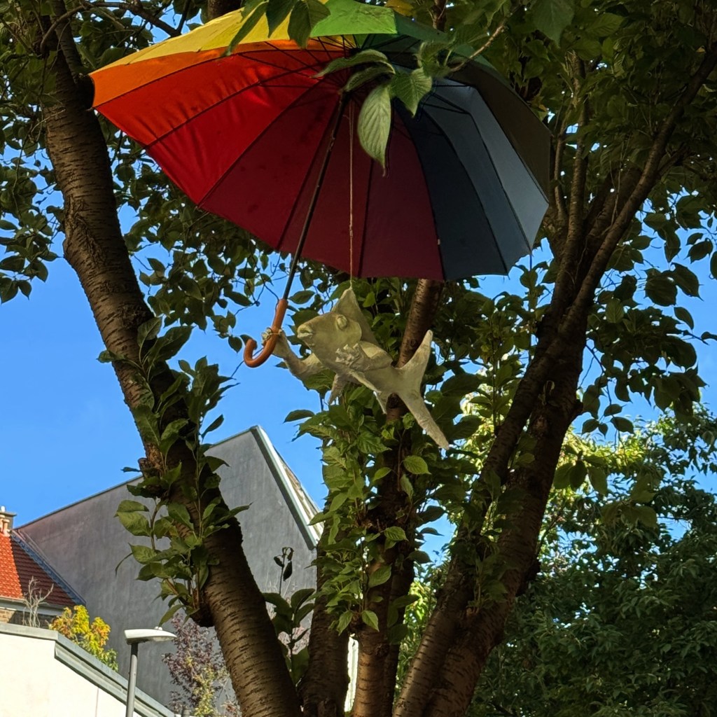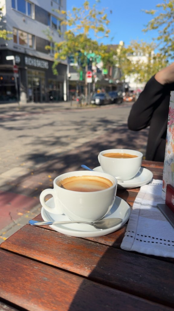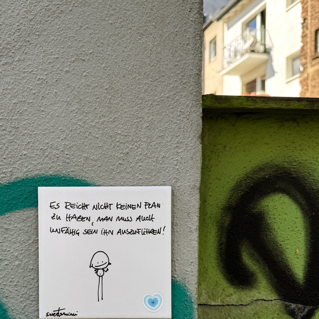 Since we skipped sight-seeing in Düsseldorf before the show, Sunday became our chance to slow down and enjoy Cologne before I had to head to the airport. We had breakfast outside in the sunshine and then wandered through Köln-Ehrenfeld. I always end up scanning the walls for Sweetsnini tiles, and this time I spotted five of them! Sweetsnini is a Cologne-based tile artist whose little “Ninis” characters have been appearing around the city since 2016, often with witty or pointed remarks about current events. Her hand-drawn tiles have spread to Hamburg and Berlin as well, but Ehrenfeld is her home turf. When walking there I make a habit of treasure hunting for the tiles and I recommend everyone who visits to do the same. Her artwork can also be found in the Urbanshit-gallery