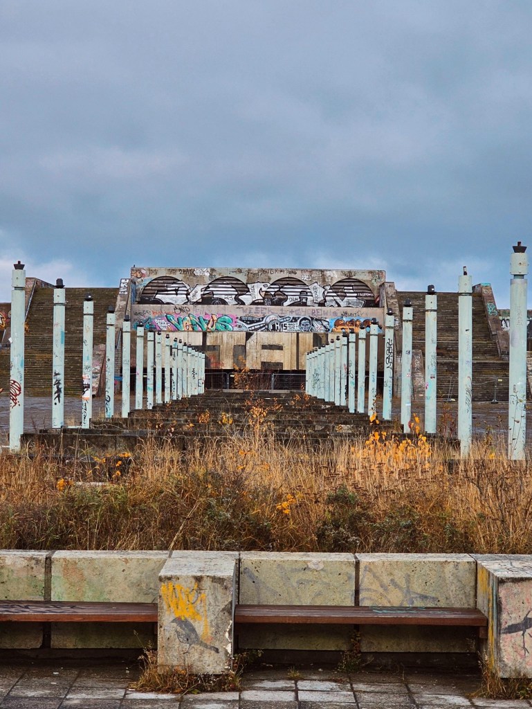 Nearby stood the impressive but worn-down Tallinna Linnahall, originally built for the sailing events of the 1980 Moscow Olympics when Tallinn was still part of the Soviet Union. Beneath the same roof there used to be an ice-skating rink, later followed by a concert hall that remained in use until 2010. Today itโs closed and decaying, a huge, concrete structure covered in graffiti, looking as if no one has cared for it in decades. On the seaside thereโs even an old public heliport also long out of use. A few curious tourists wandered around, just like us, trying to take in this strange, time-frozen (and very Soviet-looking) monument by the sea.