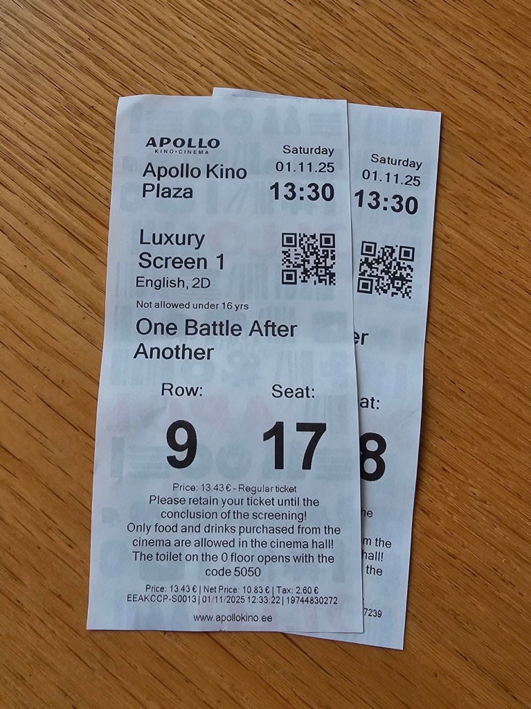 We then strolled towards the Apollo Kino Plaza, a cinema situated in Rotermann City. We bought some popcorn and a Pepsi. We watched the film โOne Battle After Anotherโ and the cinema itself was top-notch. The sound was great, the seats were comfortable and you could even lean back and rest your feet as the seat โunfoldedโ. The film was in English with both Estonian AND Russian subtitles, an interesting little cultural twist.